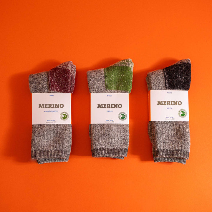 Lämpöä ja pehmeyttä talven kylmyyteen. Merinosukat on valmistettu korkealaatuisesta merinolampaan villasta, joka ei kutita tai ärsytä ihoa. Luonnostaan antibakteerinen ja lämpöä eristävä villa pitää jalat mukavina kaikissa olosuhteissa. Erityisen pehmeä sisäpintakudonta takaa käyttömukavuuden. Sukka pulkkamäkeen tai monoon - talveen ja kotioloon!